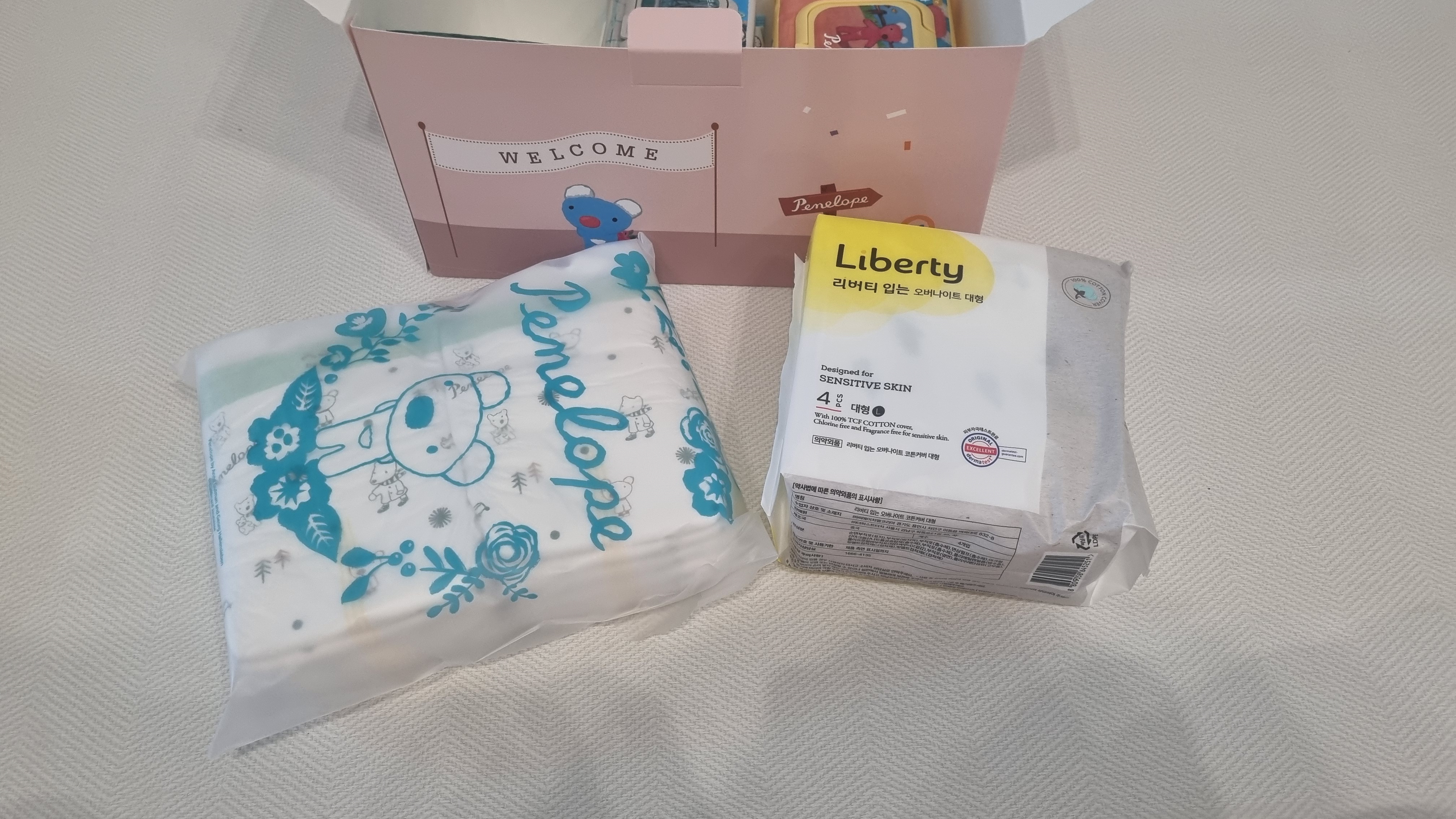 제일 먼저 꺼내본 것은 페넬로페 씬씬씬 플러스 신생아 기저귀 샘플팩과 리버티 오버나이트 생리대였는데요. 저는 아직 출산이 한달 넘게 남아서, 아기 기저귀는 따로 구매하지 않고 있었고, 또 신생아 기저귀는 아이가 태어나고 나서 사이즈 등을 보고 병원 및 조리원 퇴소 후에 구매해도 늦지 않는다고 하여 하나도 구매를 하지 않은 상태였어요.