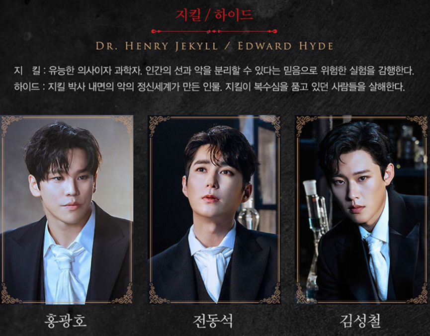 두개의 인격을 넘나들며 극이 펼쳐지는 만큼, 최고의 기량을 가진 배우들만이 설 수 있는 무대로 손꼽히는 지킬앤 하이드의 이번 시즌에는 '지킬/하이드' 역에 홍광호, 신성록, 최재림, 전동석, 김성철이 극을 이끌어 갑니다.