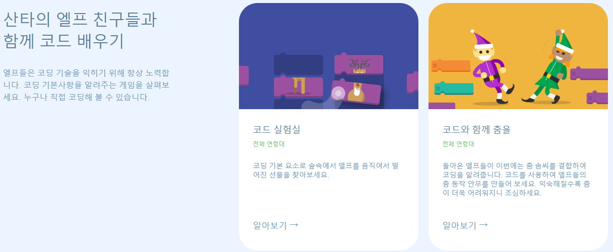 산타추적기 첫 페이지 왼쪽 하단의 "가족 사용자 가이드"를 클릭하면, 산타의 엘프 친구들과 함께 코드 배우기, 전세계 연말 모스 알아보기, 엘프 만들기, 산타 셀카 등등 다양한 게임과 활동들을 즐길 수 있습니다.
