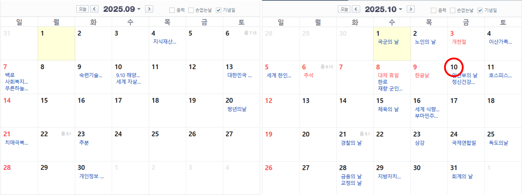 10/3 : 개천절, 10/5 ~ 7 : 추석, 10/8 : 대체휴일, 10/9 : 한글날