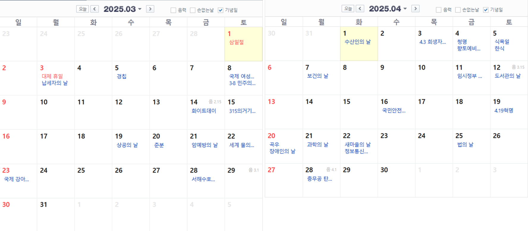 매월 공휴일 일정을 감안하여, 연차를 사용하면 좋은 날을 살펴보겠습니다.