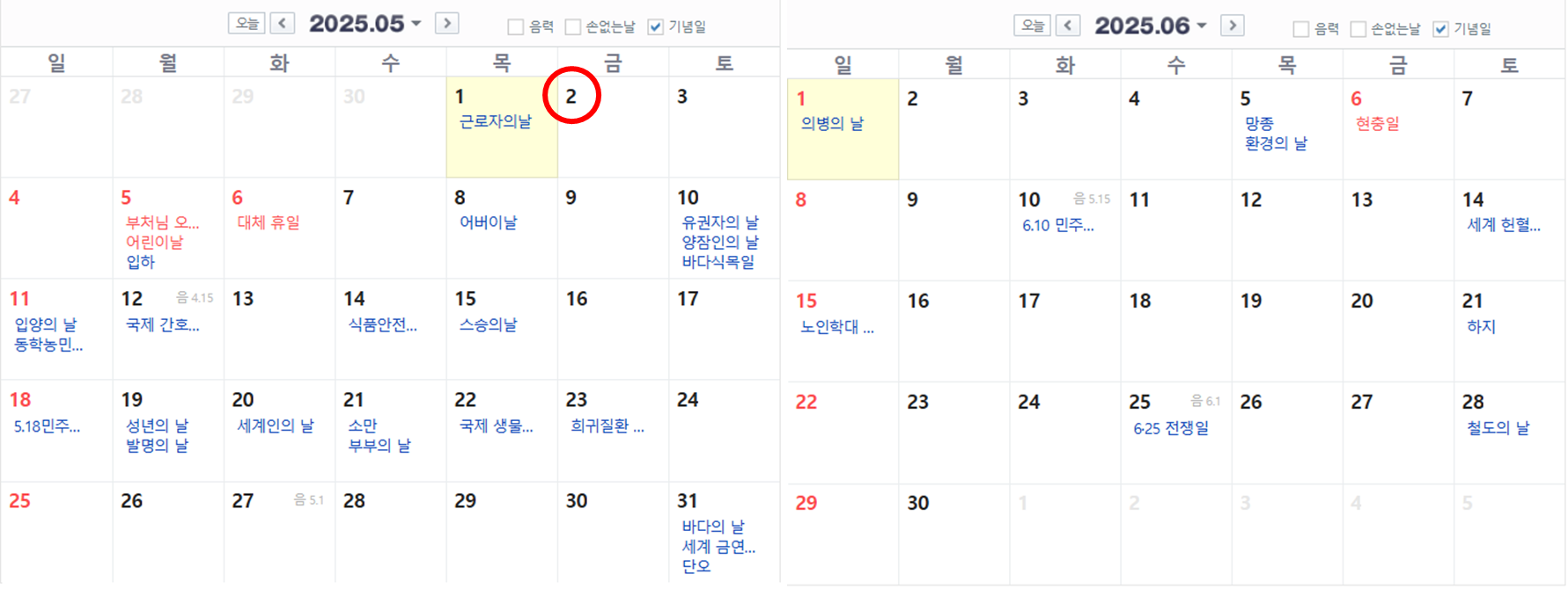 5/1 : 근로자의날, 5/5 : 부처님오신날 & 어린이날, 5/6 : 대체공휴일