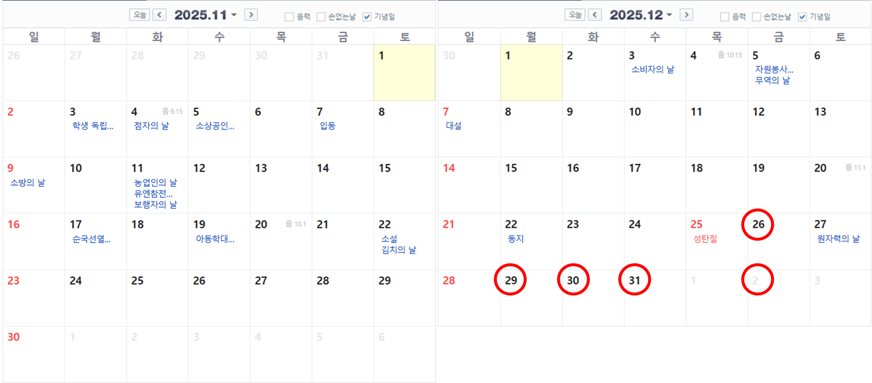 + 12/26, 12/29~31, 1/2 연차 사용 시, 12/25 ~ 1/4 까지 총 11일의 휴가 가능
