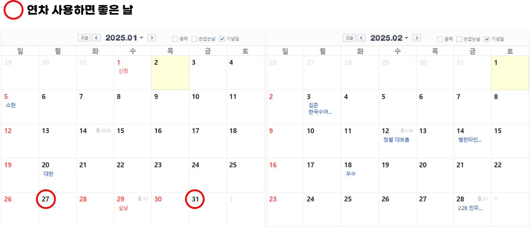 + 1/27, 1/31 연차 사용 시 1/25 ~ 2/2 까지 총 9일의 휴가 가능