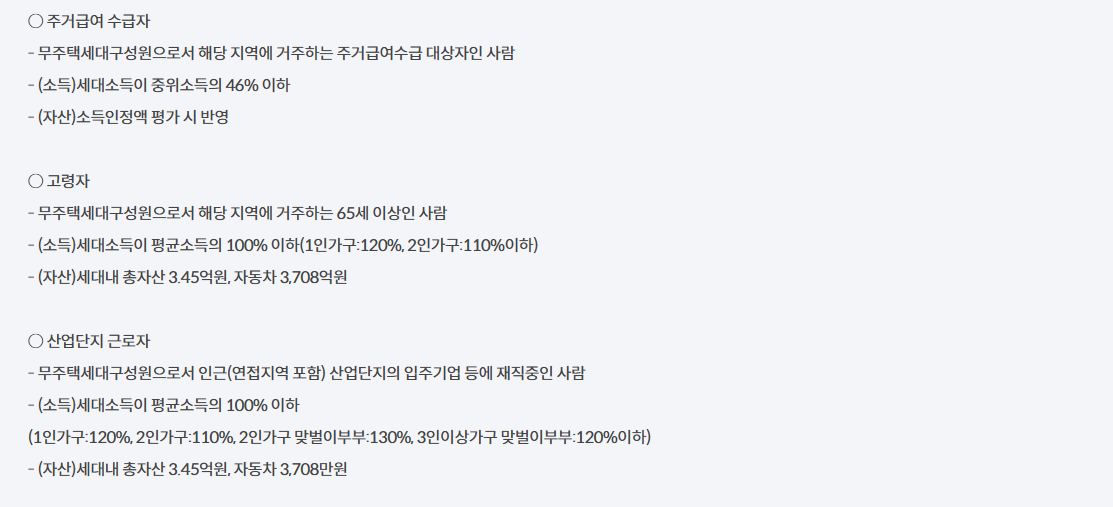 - 지원대상 : 대학생, 청년, (예비)신혼부부, 한부모가족, 고령자, 주거급여수급자, 산업단지근로자